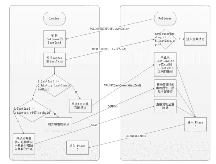 这一阶段Follower发送他们的lastZxid给Leader,Leader根据lastZxid决定如何同步数据。这里的实现跟前面的Phase 2有所不同:Follower收到TRUNC指令会终止L.lastCommitedZxid之后的Proposal,收到DIFF指令会接收新的Proposal。